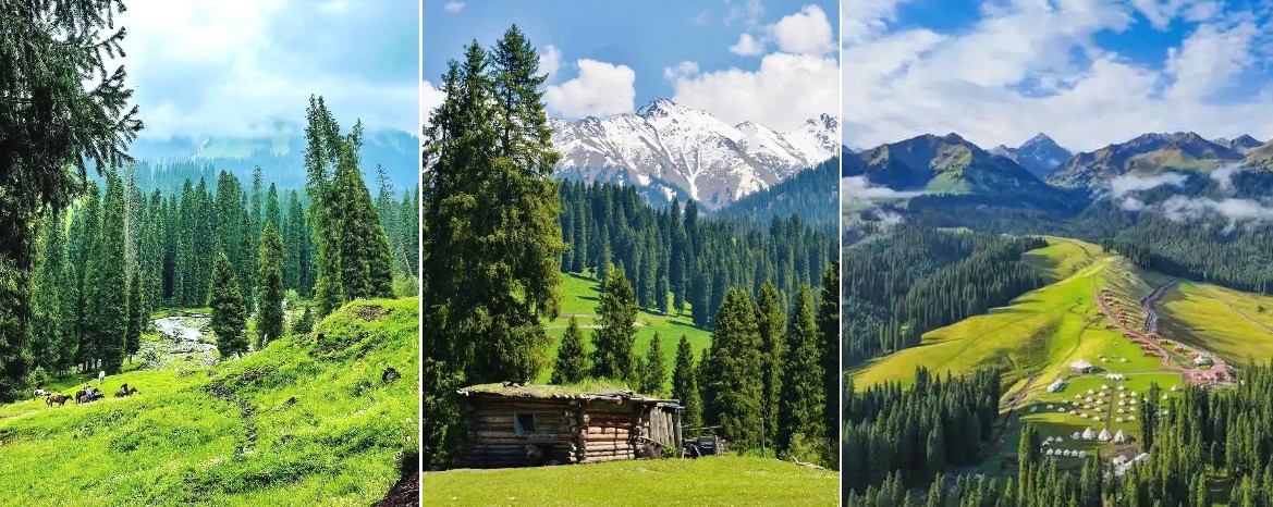 這裡是天山山脈森林最繁茂的地方,擁有單位蓄材量罕見的雲杉森林資源,完整的原始森林類型及植被是整個天山森林生態系最為典型的代表。景區內山峰聳立,最高峰喀班巴依峰海拔高達4257米,常年積雪,與山間溪流、草原、森林交相輝映,構成了一幅幅動人心魄的畫卷。