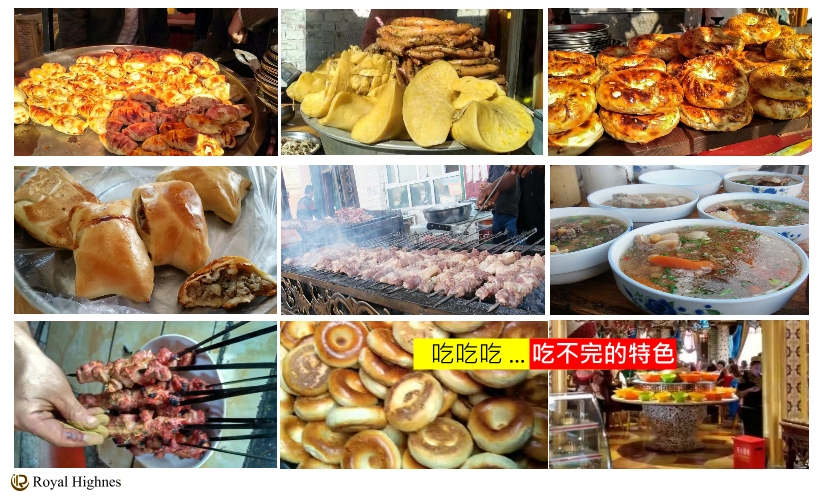 接著當然就屬烤全羊、烤脆皮羊腿、饢坑烤肉、饢包肉、烤包子、 烤鴿子、風乾肉、手抓羊肉、冷水魚 .... 椒麻雞、紅柳烤肉、胡辣羊蹄、燻馬肉、炒丁丁麵、炒米粉、揪片子等等,也是值得讓人回味的新疆美食。