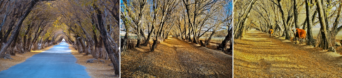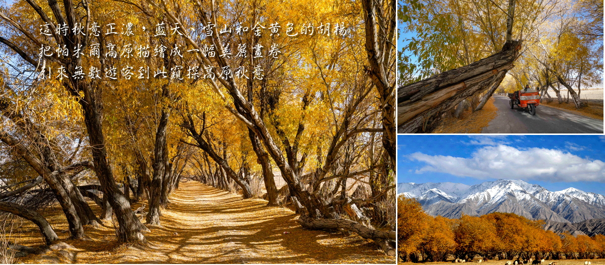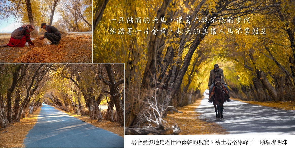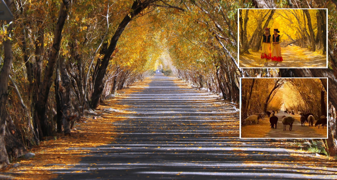 金秋的色彩,車行其中,人立其間,暖暖的陽光透過秋葉的縫隙灑落下來,意境很美。 最令人印象深刻的是村裏通往外界的金色林蔭大道,在這裡眺望遠處紅色高山腳下的村落。在塔合曼鄉間村落裡的樹洞感受陽光明媚,循著秋天的足跡,樹葉伴著風的節拍,在空中飄舞,輕鬆地飄舞著,慢慢地落下。在這裡能看到牧人趕著成群的牛羊出來吃草,美麗的塔吉克姑娘在炊煙升起的氈房前擠羊奶,更是人與自然的融合。