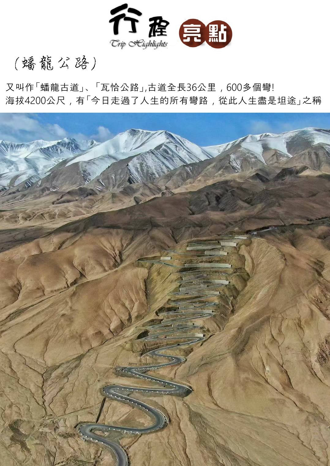 帕米爾高原的盤龍公路 "走過了所有彎路,從此人生都是坦途" 這條公路給人最大的印象就是,公路是在山上繞來繞去的,比怒江72拐還刺激,足足有600個彎道。盤龍公路全長75公里,有30多公里的公路是在山上繞彎的,跨越4100米的海拔,看起來是比較壯觀的。 黑色的柏油路面猶如一條東方的巨龍,騰躍帕米爾的山巔之上。黑色的柏油路和淺黃色的山體形成鮮明對,明暗相間,視覺非常震撼。蟠龍古道,驚險刺激,風景極佳。蟠龍古道正式名字叫吾格亞提盤山公路,它是新疆喀什地區塔什庫爾幹塔吉克自治縣城到瓦恰鄉之前的公路,全長36公里,有608個發卡彎道,180度的大彎全部集中在最後一段山脊上,險峻路段,讓自駕愛好者們都深深嘆服。