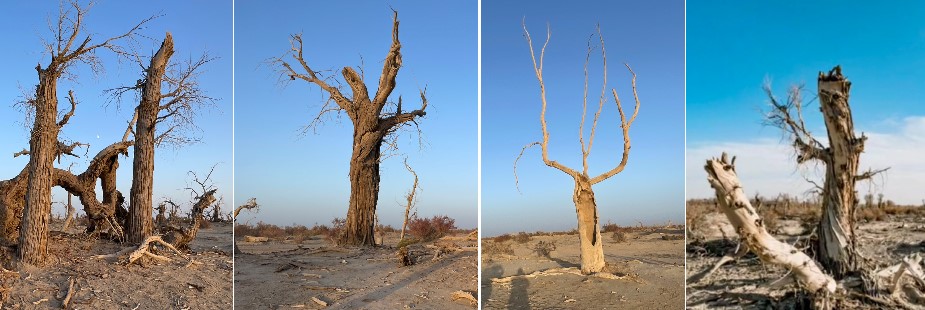 魔鬼林 就像神奇的大自然導演的一幕啞劇,它們用胡楊樹的最後肢體語言,在荒涼的大漠中,以一種匪夷所思的方式,詮釋著「一千年不死,一千年不倒,一千年不腐」的生命與水的故事。 塔里木盆地乾旱少雨,胡楊枯死之後,常常能夠在沙漠之中聳立數百年,甚至千年。在這個過程中,胡楊細小的枝幹被風沙消磨殆盡,整片森林往往僅剩胡楊碩大粗壯千姿百態的主幹。因此,便有了「魔鬼林」的稱謂。在這片沙漠的深處,一切都是那麼古老、安靜、原始,就像安靜的露天博物館一樣,在天空下,在歷史的長河中流淌,最終也只留下了遺跡。