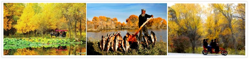 沙雁洲景區 是癡行者的巴札,攝影師的天堂,探險家的樂園。這裡未經雕琢的自然美景從來就是口碑載道的事實:沙丘高低跌宕,有的沙丘高達20餘米;胡楊錯落參差,數人合抱的古樹隨處可見;間道:蜓曲折,馬道與羊道的揚塵如同輕紗薄霧;湖水碧波蕩漾,浮光掠影總是異彩迷人;湖面眾鳥偎依,不同族群相安無恙,繪出和諧靜逸的畫面;「喀盆舟」上漁夫晨捕或晚巡,那情那景,畫意濃,詩意也濃! 沙雁洲景區是胡楊旅遊、塔河旅遊、沙漠旅遊的一個濃縮,「春日有百花眾香的繚繞,夏日有可汗儀式的盛大,秋日有梵高手筆的揮霍,冬日有銀裝素裹的矜持”,這是太陽島最愜意的寫照。